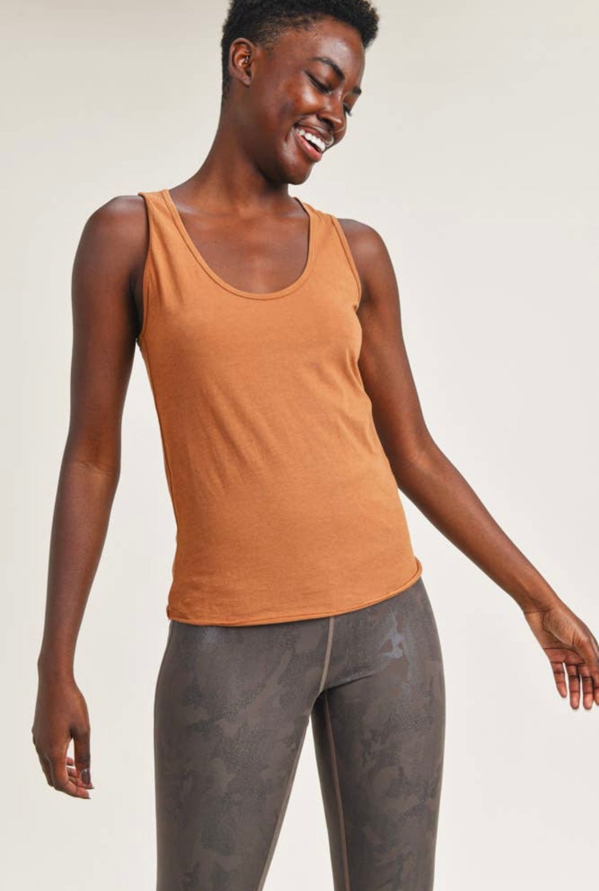 Complete your outfit with this flattering racerback top with a rolled hem in a neutral brown color. Soft and still breathable. Made of cotton without shrinking too much after the first wash. For a fitted look, stay true to size. For a more relaxed look, size up one size.